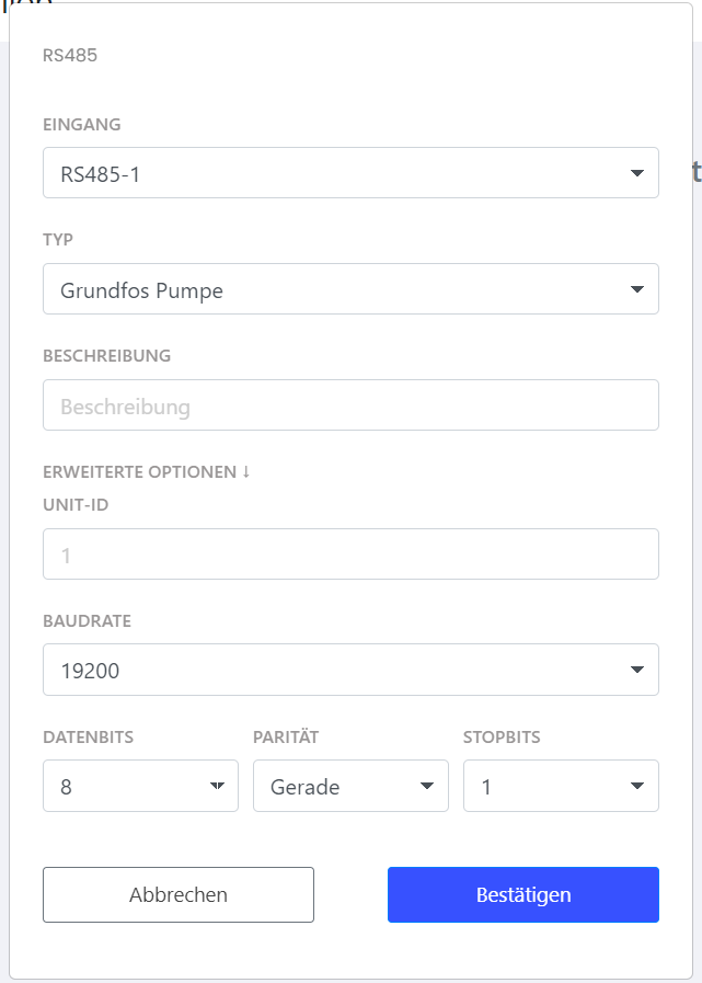 Stellen Sie sicher, dass die Modbus-Schnittstelle an dem jeweiligen Endgerät aktiviert ist. Schritt 5: :: Sobald die Daten vollständig eingetragen sind, „Speichern“ betätigen.